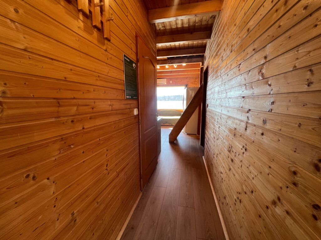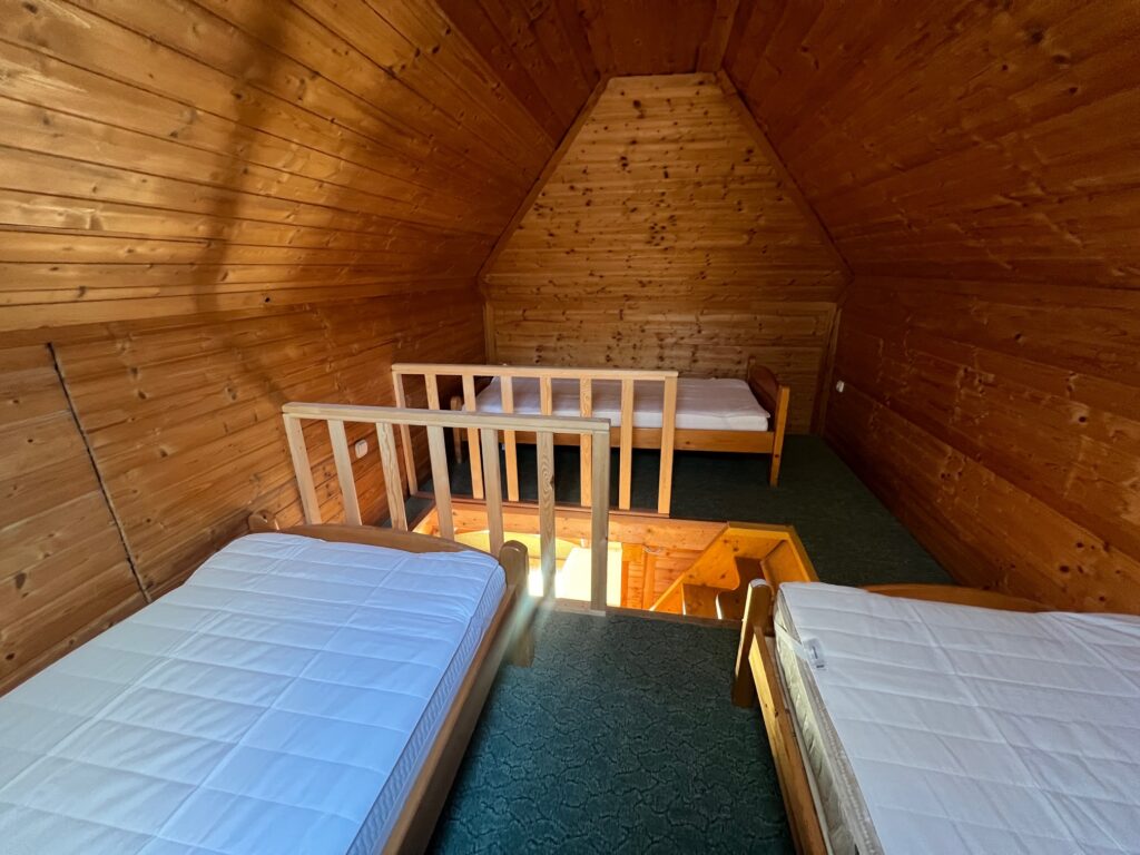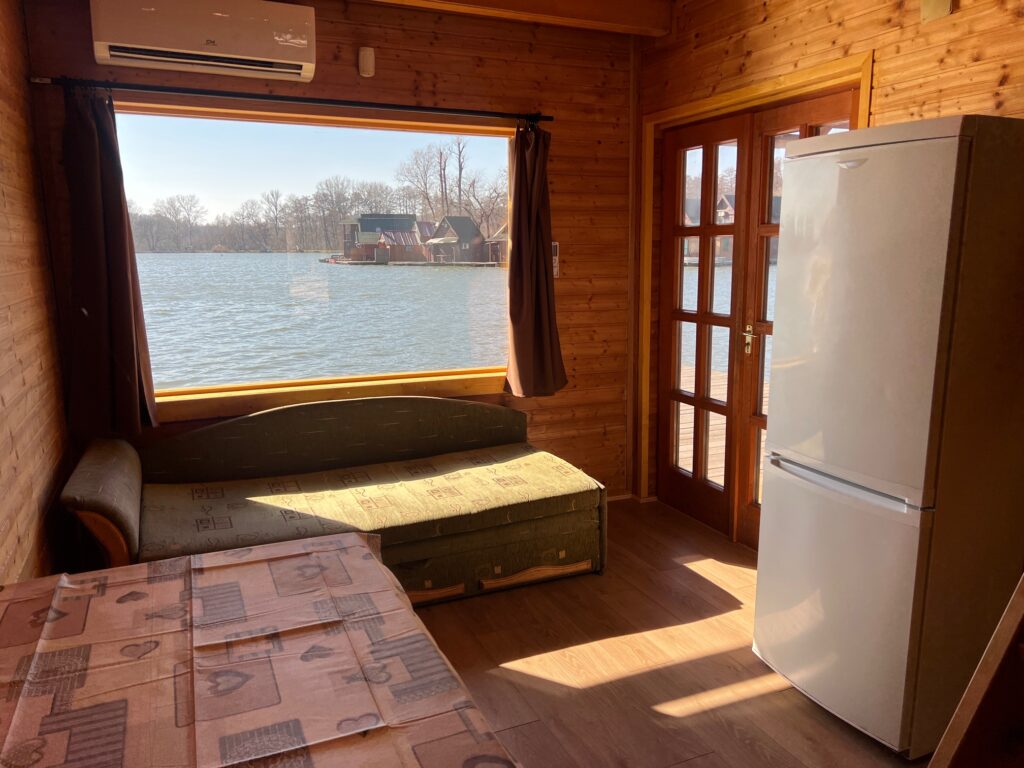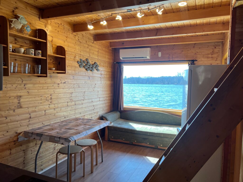 Az alsó szinten egy kihúzható kanapé, egy konyhapult, egy külön hálórész dupla ággyal, és egy padlófűtéses fürdőszoba, az emeleten három ágy található. KLIMATIZÁLT faház. Télen is bérelhető!. A házban 6, a stégen 3 ember fér el kényelmesen. A stégen fedett kiülő, paddal is található.